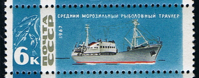 On this stamp is depict a medium size trawler of the Majak type, with reefer capacity of which around 130 vessels were built on several Russian yards.