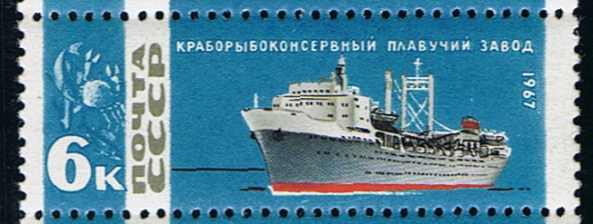 The 6k stamp depict a Russian built Shellfish Cannery Ship of the Andrey Zakharov type of which 14 were built on the yard of Admiralteiski Shipyard at Leningrad for the Russian Government, between 1961-1969.