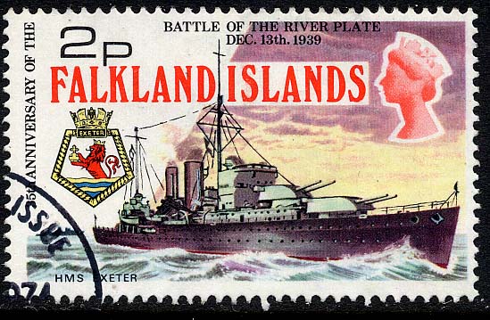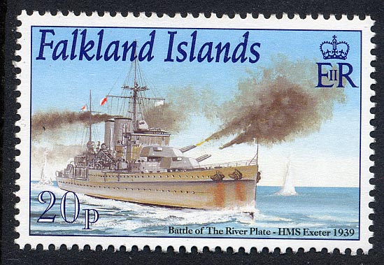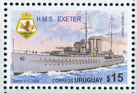 13 December 1939, Battle of the River Plate, she was a unit of Group G which damaged the German pocket battleship "ADMIRAL GRAF SPEE" which later was scuttled by her own crew by explosives. The HMS "EXETER" under command of Capt. F.S.Bell got heavy damage, after 30minutes in battle four of her 8 inch guns were put out of action, and she was on fire, her main steering gear was smashed, and hand steering had to be employed. She lost during the battle 5 officers and 56 ratings and 3 officers and 20 ratings were wounded. She retreated from the battle and had to return to the Falkland Islands for temporary repair.