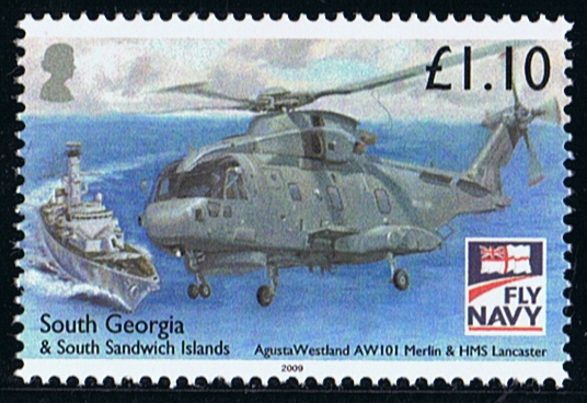 The stamp depicts a Westland Merlin helicopter and HMS LANCASTER.