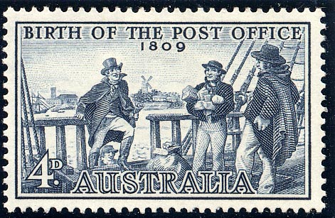On April 22, 1959, the Australian Post Office issued a 4d. stamp, significant of the 150th anniversary of the establishment of the dominion's first official post office on April 25, 1809, when Isaac Nichols took up his appointment as the first postmaster in Sydney, N.S.W. The design of the stamp shows Nichols boarding the brig Experiment, the first vessel to reach Sydney from the United Kingdom after Nichols had received his appointment. The Experiment of 142 tons, dropped anchor in Sydney Harbour on June 26, 1809, with convicts and also his Majesty's mails. A merchant vessel, she had left Cork Cove on January 21, 1809, in a West Indian convoy (because of the war with France) and had reached Sydney via Cape Horn. This Experiment should not be confused with a local vessel of the same name, in port about the same time, and normally running between Port Jackson and the Hawkesbury. No doubt, Nichols would have received some mails by vessels returning from Van Diemen's Land or Norfolk Island and perhaps from whalers touching at Sydney after his appointment on April 25, 1809, and before the arrival of the Experiment two months later.