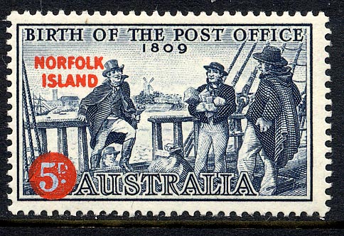 The Australian 5d. stamp commemorating the first Australian Post Office has now been overprinted for use in Norfolk Island. Some further information about the ship depicted has come my way since the first stamp was issued. The stamp design which shows the first officially appointed Australian Postmaster arriving aboard the brig Experiment to carry out his first public duty (conveyance of the mail from ship to shore) gives no idea that the vessel was the smallest ship ever to be employed in the Convict Service and that below her hatches were 60 women prisoners.