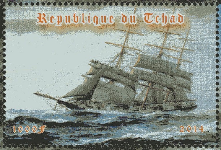 The design stamp is made after painting of H. Shimidzu- Downeaster Henry B. Hyde off Cape Horn.
