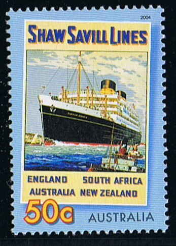 The modern liner on the right-hand side of the stamp is the Shaw Saville & Albion Line vessel "Dominion Monarch", the largest ship sailing to New Zealand, and the most powerful motor vessel in the world. She was built on the Tyne by Swan Hunter & Wigham Richardson and was completed in 1939. A one class ship, she has accommodation for 517 passengers.