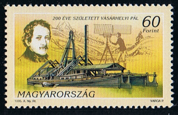 The portrait of Vasarheylyi is from a drawing of Miklos Barabas – is shown on the left of the stamp. The main part of the stamp is taken up by a picture of a ship that was used for surveying the sections of the river.