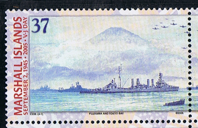 Mr. Mario Rosner has identified the ship depict on this stamp as the USS DETROIT, she was the only of the four funnel Omaha class present at Tokyo Bay during the signing of the Japanese capitulation on board the USS MISSOURI on 02 September 1945. Comparing the stamp with a photo of the ship he is correct she is the DETROIT, with in the background the Fujiyama Mountain.