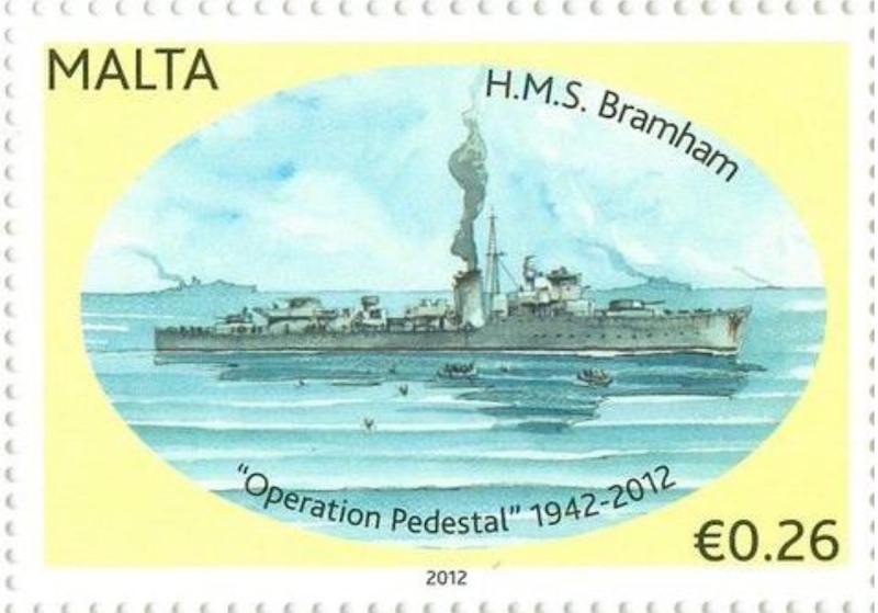 She was then used for the famous Pedestal Convoy to Malta with other Royal Navy ships. She escorted the damaged tanker OHIO inside Malta on 13 August 1942; she is the vessel alongside the portside of the OHIO on the stamp. The starboard vessel is HMS PENN.