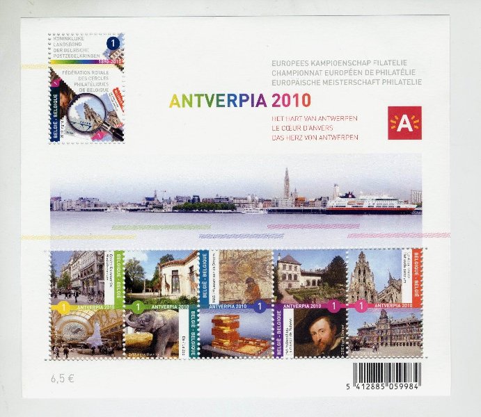 The Belgian Post Office has issued another miniature sheet in the build up to Antverpia 2010. The scene, again, shows the Antwerp quayside. There are three ships to be seen. Two are small white hulled excursion vessels, probably from the Flandria fleet. The third vessel, on the right hand side of the quay, is the Norwegian cruise ship FRAM from the Hurtigruten fleet.