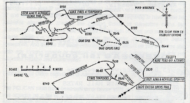 EXETER rejoined the fight. Langsdorf decided to escape under cover of a smoke screen. AJAX and ACHILLES, though badly damaged, still had their speed and they hung on grimly regardless of how GRAFF SPEE twisted. The battle was over in an hour and twenty minutes.