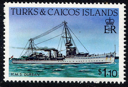 HMS DURBAN 'D' class cruiser, 4850 tons, 472 ft. x 46.5ft. x 14.5ft. 2 shaft geared turbine. 29 knots. Armament 6-6 inch, 3-4 inch AA, 2-2pdr. AA, 12 -21 inch TT. Built by Scotts, launched May 1919. Expended as breakwater 9th June 1944.
