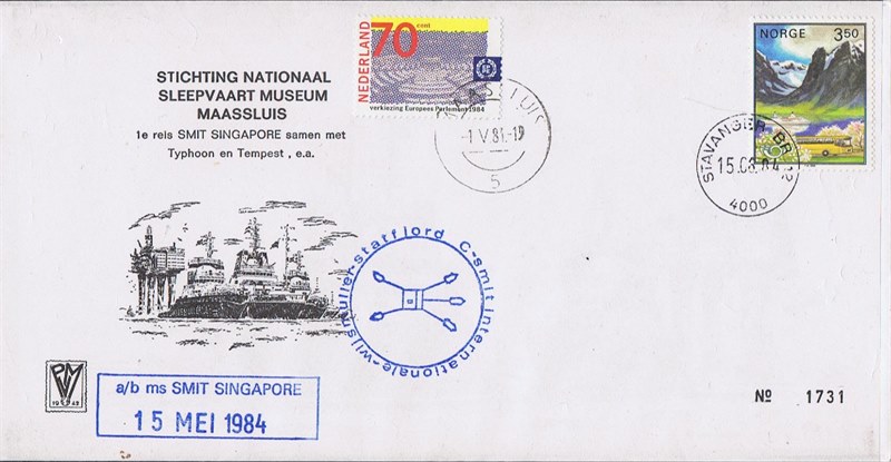 This Dutch envelop was carried on board the Dutch tug SMIT SINGAPORE during her first towing job, and to raise funds for the Foundation of the National Towing Museum in Maassluis.