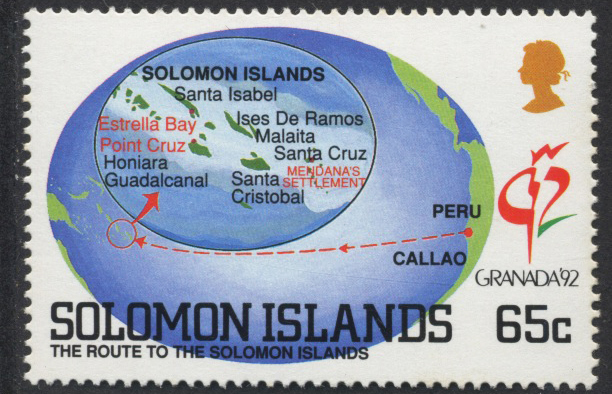 From 1567 to 1568, Alvaro de Mendana, the 25-year-old nephew of the Governor of Peru, led the first European expedition into the South West Pacific. Previous Spanish navigators had sailed west from Mexico, following courses north of the Equator towards Asia. Mendana, by contrast, sailed from Callao in a south-westerly direction, searching for islands believed to exist 600 leagues from the Peruvian coast. Incas were said to have visited the islands and brought back ‘gold and silver, a throne made of copper, a multitude of black slaves and the skin of an animal like a horse’.