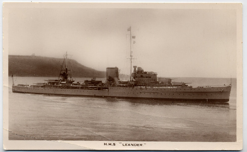 HMS Leander, the 7289-ton (standard displacement) lead ship of a class of five light cruisers, was built at Devonport, England. Ships of this design included Leander, Neptune, Orion, Achilles and Ajax. The British Leander-class armament comprised eight 6” guns, and she could do 32.5 knots; as such, she was a representative pre-war cruiser. Completed in March 1933, HMS Leander served with the Royal Navy until April 1937, when she was transferred to New Zealand and became HMNZS Leander. The cruiser mainly served in the Pacific and Indian Ocean areas until 1940, then operated in the Mediterranean and Red Sea. On 29 October 1940 her embarked aircraft attacked a fish cannery at Mogadishu, Somalia, and on 27 February 1941 she encountered and sank the Italian auxiliary cruiser RAMB 1 near the Maldive Islands.