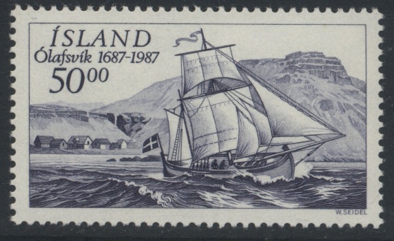 The stamp depicts the vessel under full sails near the road of Ólafsvik. The stamp was issued for the 300th Anniversary of the trading post in Olafsvik.