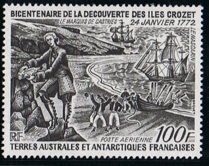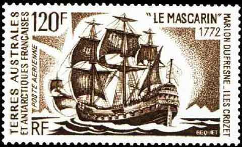 The TAAF stamp depicts the landing on the Crozet group and the two ships which took part in the expedition MASCARIN and MARQUES DE CASTRIES.