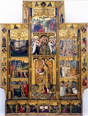 The altarpiece dedicated to Santa Ursula at the church of Cubells, painted by Joan Reixach in 1468, and the model of the Mataró cog shows that one-masted vessels were still being used in this part of the Mediterranean around the middle of the fifteenth century. However, they both contain construction features that are similar to the Zumaia. The image on the altarpiece shows in some detail the morphology of the stern, which cannot be clearly seen in the picture from Zumaia. The bow of the Mataró cog is very similar to that of the Zumaia. © José Lopez