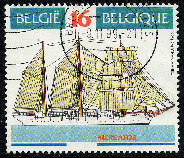 A set of four sail training ships from Belgium issued in August 1995 brings us a newcomer on stamp -- the barquentine MERCATOR. (other values show SAGRES. KRUZENSHTERN and AMERIGO VESPUCCI)