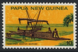 The 10c stamp shows a Tami islanders’ 2-masted morobe. These people are of mixed Melanesian and Polynesian stock and are noted ship-builders and traders. The morobe was a sturdy 2-master with two stanchions on the outrigger side which helped to support the platform above; they did not project higher to carry a rail. On the offside of the lower platform a vertical framework supported that end of the upper platform and extended a long way above it. The lower part between the platforms was boarded over. By simple shifting of both sails the canoe could sail either way. Pandanus leaf was used for both the sails and the sleeping mats.