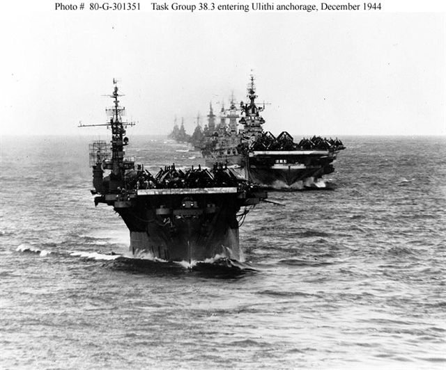 The carrier departed Eniwetok 29 August, and sortied with Task Force 38, under the command of Adm. William F. Halsey for air assaults on Peleliu and airfields in the Philippines as the preliminary steps in the invasion of the Palaus 15 to 20 September. During October, she was off Formosa and the Pescadores Islands attached to Vice Admiral Mitscher's Fast Carrier Force. Later in the month, as the Navy carried General MacArthur back to the Philippines, LANGLEY was with Rear Admiral Sherman's Task Group protecting the Leyte beachheads. In a desperate effort to parry this deadly thrust into her inner defenses, Japan struck back with her entire fleet. On 24 October, LANGLEY 's planes helped to blunt the first and most powerful prong of this counter offensive, Admiral Kurita's Center Force, as it steamed toward the San Bernardino Strait and the American beachhead. The following day, upon word of Japanese carriers north of Leyte, she raced to intercept. In the ensuing battle off Cape Engano, Mitscher's force pulverized the enemy fleet. The Japanese lost four carriers, two battleships, four heavy cruisers, one light cruiser, and five destroyers. LANGLEY 's aircraft had assisted in the destruction of the carriers ZUIHO and ZUIKAKU, the latter being the only remaining carrier of the six that had participated in the Pearl Harbor attack. Japan's chances for final victory had been reduced to nil by the great Battle of Leyte Gulf.