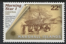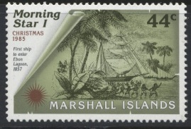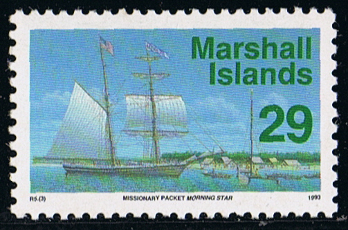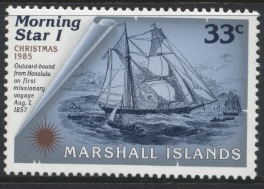 The first Christian service in the Marshall Islands was held on 09 November 1857 at Ebon Atoll. The Chieftain of the atoll, Kaibuke, ordered the natives to pull MORNING STAR through the narrow channel through the reef (as seen on the 44c), and she was the first ship to anchor in Ebon Lagoon, which became her base of operations. She made yearly trips of over 10,000 miles until worn out and sold in Honolulu on 12 December 1865.