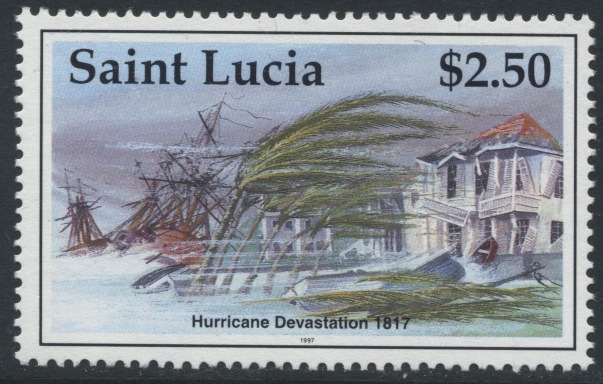 In July 1997 St.Lucia issued a set of four stamps featuring ships which met misfortune at, or just off, the island. The harbour of Castries was devastated after the dreadful hurricane of October 21st,1817, and this is scene depicted on the $ 2.50 value. According to one account eighteen vessels were driven ashore during the hurricane; nine of these, it states, were small vessels belonging to the island'--- they were totally lost; the other nine vessels were,it seems, all refloated; four of these were the JAMES, the LARK, the JOHN & MARY, and the YOUNG WILLIAM, all four belonging to Halifax, N.S. The only other vessel mentioned by name is the ship LADY HANNAH ELLICE ( sometimes spelt LADY HANNAH ELLIS) , of London; evidently she was the largest vessel in port at the time, and it is my contention that it is this ship which is depicted on the stamp.