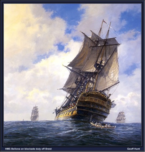 Guinea Bissau in MS shows the ship Bellona from paintings Geoff Hant:HMS Bellona on blockade duty off Brest 1760.