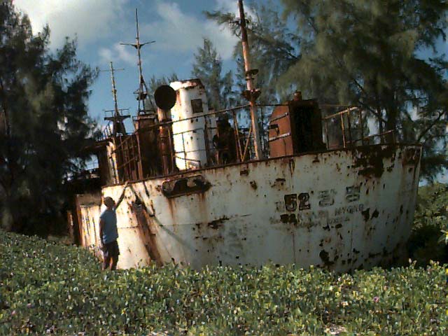 She is laying now as a rusty wreck on the beach under the casuarina trees and is home to thousands of hermit crabs.