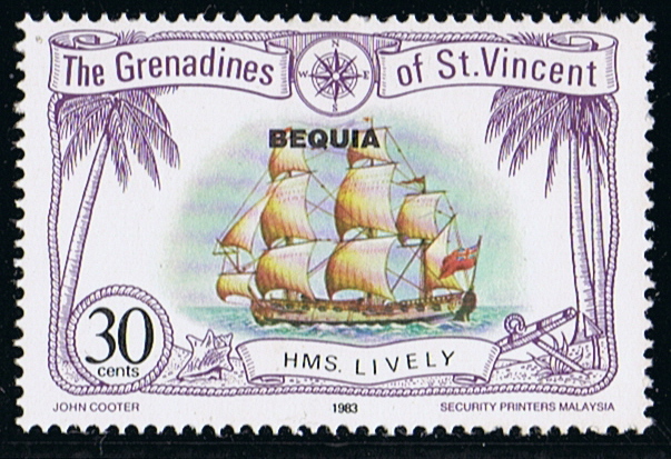 Wikipedia gives that in 1779 a small French flotilla with as flagship the Le LIVELY sailed from Martinique to capture British controlled Saint Vincent, so at that time she was not a HMS vessel as given on the stamp, by counting the gun ports on the stamp I still believe she is the 20 gun ship LIVELY completed in 1756.