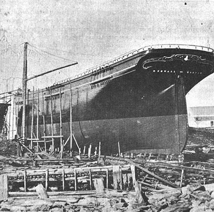 The ship, with her fine sturdy lines, is shown in the photograph on the left on the 'ways' (slipways) at Pennell Shipyard. Her name, here given as B. Sewall - Boston, can just be seen on her stern.