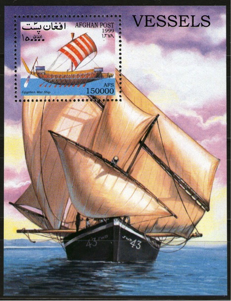 On the area of the small sheet(MS) of the Afghan depicted the dhow of Indian Ocean-tony №43- «Maria Antoraj». The thoni is a comparatively new arrival in the dhow world. It consequently lacks the aristocratic lineage of other dhows and it is questionable whether the vessel can legitimately be classed as a dhow. The hull possesses none of the usual dhow characteristics and has evolved from the common sailing lighters that were built at Tuticorin about the time of the First World War expressly for ship to shore lighterage work. A number of the older vessels still perform this task entirely under sail. As a trading vessel the thoni gradually grew in stature and when its voyaging became more extended hulls became larger and more sail was added. Today the Tuticorin thoni is undoubtedly the most impressive of all the dhows carrying the most fantastic array of sails. It is easily identified, even when hull down in the moist Malabar atmosphere.