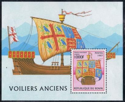 The ship depicts on this souvenir sheet where owned by the Cinque Ports, the sails which carried the coat of arms of this ports as seen on the souvenir sheet is a fantasy of the designer, normally she carried sails without any coat of arms.