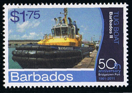 The $1.75 value shows the tug BARBADOS II docked at the quay. It is the larger of two modern tugs that help with docking operations for the cruise liners. If you have been on a cruise that stopped in Barbados, chances are you have seen this one at work