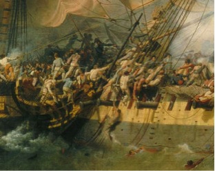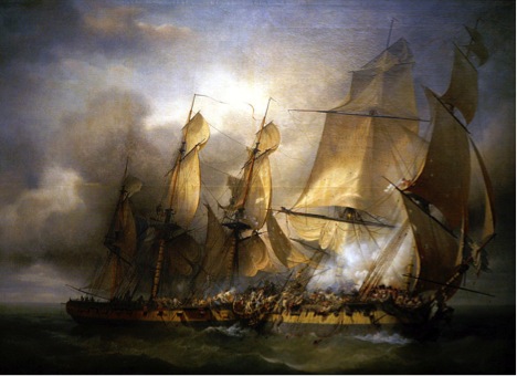 Both ships fired a last broadside and closed their gun ports. Bayonnaise lost numerous men, and her captain, Richer, had an arm shot off.Nevertheless, the French brought their ships to the frigate, and cleared her deck with grapeshots and musketry fire from her tops. The British officers were wounded and taken below deck, leaving only ailing lieutenant Joseph Briggs in command. Having attached the corvette to the frigate, the French used their bowsprit to bridge the gap between the ships and climb onto the taller Ambuscade .