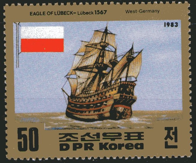 North Korea has launched a postage stamp in 1983 the Eagle of Lubeck with the value specified 50 Chon on the market.