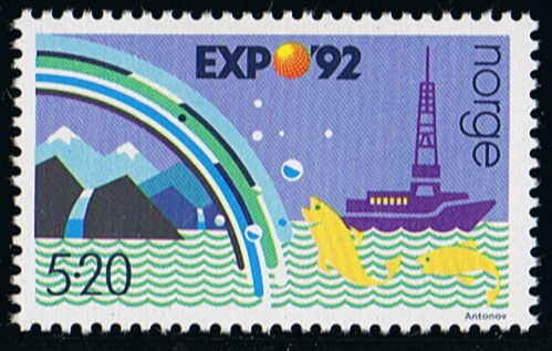 Norway issued in 1992 two stamps to commemorate EXPO 1992 in Seville, Spain both stamps shows a ship the 3.30 Kr has a stylized passenger ship with two funnels, while the other stamp of 5.20 Kr which has been identified by Mr. Morten Sæbø as the PETROJARL I via a maxi-card. The rainbow connects seen on the stamp connects Spain with Norway.
