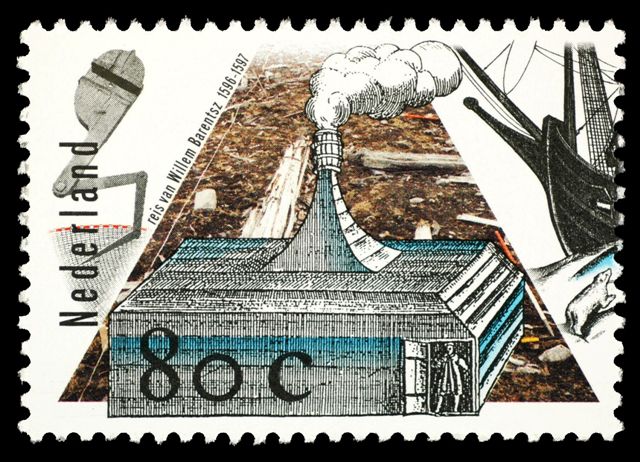 The Netherlands issued a set of stamps to honor Dutch explorers, one of this stamps shows Willem Barendsz, the house they built at Nova Zemlya, and his ship the DE WINDHOND.