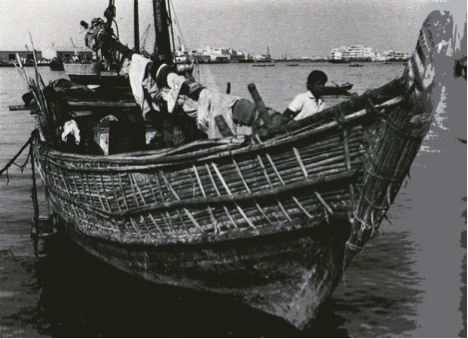 Although India has to her credit some of the finest dhows ever built she also sends to sea what must surely be the most poverty stricken. Of these the padao is perhaps the best, or more convincingly the worst example. At first sight one gains the impression that it must be constructed entirely of split bamboo and palm matting, particularly if the vessel is fully laden. A close look, however, reveals a wooden hull but with planked bulwarks only at the bows and toward the stern and even these short lengths of bulwark are invariably almost completely hidden by the bamboo and split palm screens which protect the cargo from sea water that might otherwise splash aboard. Sometimes the cargo is further protected by plastering the inside of the screens with mud. I did see in Bombay a padao with the mud plastered on the outside. The transom is the only large exposed area of the padao's hull and this is often decorated with delicate painted foliation. If the padao is really worthy of its name there is a carved representation of a parrot's head at the top of the stem. It is somewhat akin to the oculus of a kotia except that the head faces forward instead of aft. It is flanked on each side with sheaves through which mooring lines pass. These sheaves are encased in wood and even if the appendages were never intended as such they do have the appearance of a pair of wings.It is astonishing how the undecked padao manages to make its way to distant Dubai where, as already related, it takes part in the smuggling of highly profitable uncustomed goods into India. The padao, though, is essentially a coasting vessel of the north-west. At Bombay's Mahim Bay they tie up stern to shore to discharge gravel which the city's build¬ing industry consumes in great quantities.