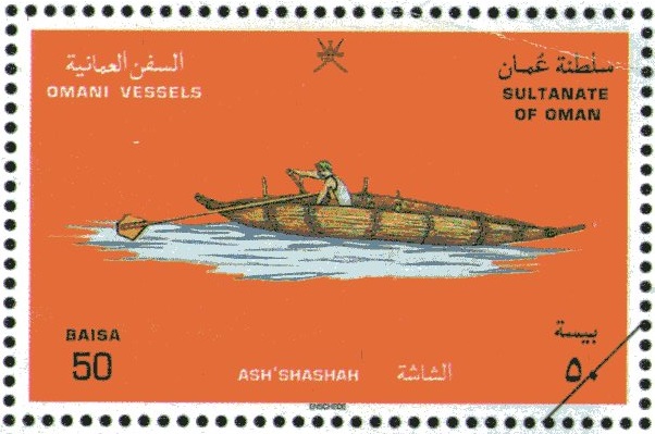 Canoe shaped reed boat still popular for along the Al Batinah coast. Constructed of the ribs of date palm leaves sewn together; originally with coir cording, now nylon. Flat bottom; fairly plumb sides; ends taper to a point. Reverse curve to the sheer with the ends lower than amidships. Deck created of the palm ribs and hogged amidships; low bulwarks;deck secured by thwarts lashed on top. Cavity originally filled with coconut bark fiber; now often of Styrofoam. This modification permits the craft to stay at sea longer, and some now serve as tenders, employed to fish out from a mother ship farther offshore.Mainly rowed using long, slender oars worked against tell single tholepins; blades vary in shape regionally.Some sail, employing a small, quadrilateral, lateen-type sail with a short luff with a light yard set to a bipod mast.