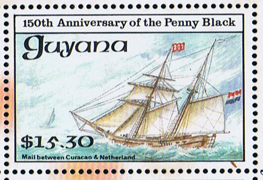 II believe the Guyana stamp issued in 1990 $15.30 with the inscription of “Mail between Curacao & Netherland” is designed after a aquarelle made by the Dutch artist Jacob Spin (1806-1875) which shows the schoenerkof (schooner-koff) MONNICKENDAM and VERWACHTING in the estuary of Texel in the Netherlands.