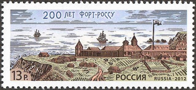 The stamp depicts a panorama of Fort Ross of the first half of the XIX century.