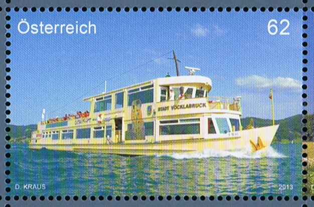 For the 100th Anniversary of the Attersee-Schifffahrt, Austria issued two stamps of which the 62 Euro stamp depict the inland passenger ship STADT VÖCKLABRUCK.