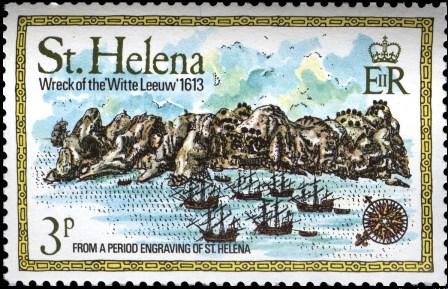 The St Helena stamp is designed based on a chart of 1589 which shows Portuguese Indiamen replenishing their stores and fresh water at St Helena. The stamp was issued for the loss of the Dutch Indiaman WITTE LEEUW of the VOC at St Helena.