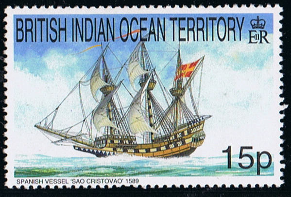 SAO CRISTOVAO is also depict on a stamp of the British Indian Ocean Territory 1999 15p sg 224, scott? It is given that she is a Spanish galleon but the only SAO CRISTOVAO I could find was built in 1581 for the Portuguese, I believe the designer of that stamp has made a mistake, anyhow at that time the Spanish flag was different as what is showed on the ship.