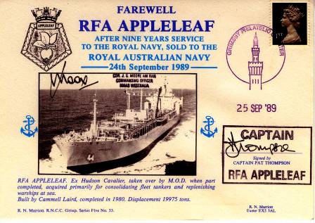 The vessel was originally built by Cammell Laird as HUDSON CAVALIER, one of four STaT 32 class oil tankers ordered by John Hudson Fuel and Shipping. She was laid down at the Birkenhead shipyard on 5 November 1973. After construction had started on three of the four ships, John Hudson found it could not afford to pay for the ships. Cammell Laird completed the three vessels, with HUDSON CAVALIER launching on 24 July 1975, and after sea trials were completed, all three were laid up in port while the shipbuilder sought to charter or sell them. On 27 October 1978, the Ministry of Defence expressed interest in chartering two of the tankers, and after conversion for use as an underway replenishment vessel, HUDSON CAVALIER entered service with the RFA on 8 June 1979 as RFA APPLELEAF The ship was acquired under a ten-year bareboat charter.