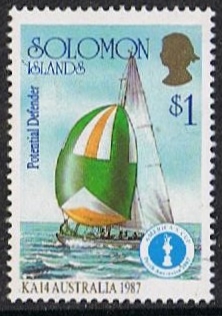 The stamp gives KA 14 which is the sail number of the Australian yacht STEAK’N KIDNEY which took part in the challenge of the America Cup 1986/87.