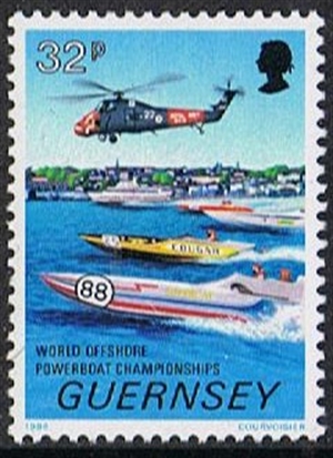 A further important element of the 32p stamp denomination as well as of the 16p showing Jethou in the distance, is the Royal Navy Rescue helicopter. The safety of competitor’s spectators and organisers must be the priority in a high speed event such as powerboating. In addition to the Wessex helicopter from RNAS Culdrose in Cornwall which is present for the week there are in attendance the local RNLI Arun class lifeboat and the St John Ambulance’s launch FLYING CHRISTINE.
