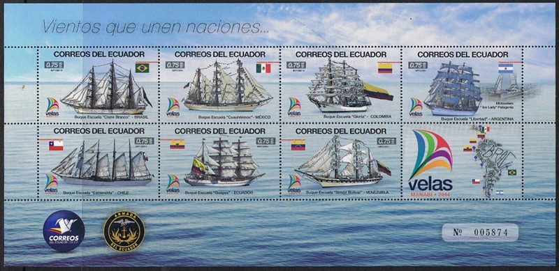 Ecuador issued in 2014 a set of 7 stamps all $ 0.75 and a label in a miniature sheet for “Sail Manabi 2014” in which school ships from South American countries visited Manabi , Ecuador from 4 till 6 May 2014.