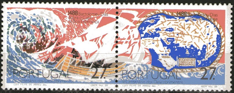This stamp features the Martellus map from circa 1488, the earliest map to record Dias’s discoveries. The original is in the British Library, London, to who acknowledgement is made.