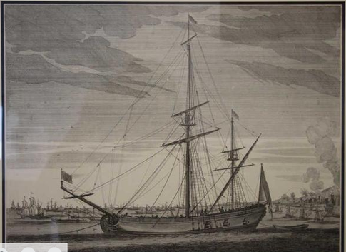 As early as 1682, five of Renau d'Eliçagaray's bomb ketches were used in the siege of Algiers. Using their mortars (known as "Petit Renaus") these ships could fling their explosive shells more than 1,300 meters - obliterating the seaward fortifications and killing many hundreds of the town's inhabitants and defenders. This engraving by Sbonski de Passebon* shows a fairly typical French galiote à bombe, of about 1690 (note how the masts and rigging are designed to allow for the upward flight of the fixed, forward-facing, mortars: these were aimed by reeling in or paying out double anchor cables at the prow, to turn the vessel this way and that as it faced its target).