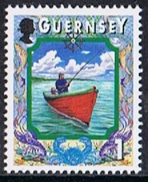 By this stamp is given by the Guernsey Post: A typical day off the west coast for the owner of a small boat with a outboard engine. A peaceful day’s fishing and hopefully a meal for the family at the end of it.